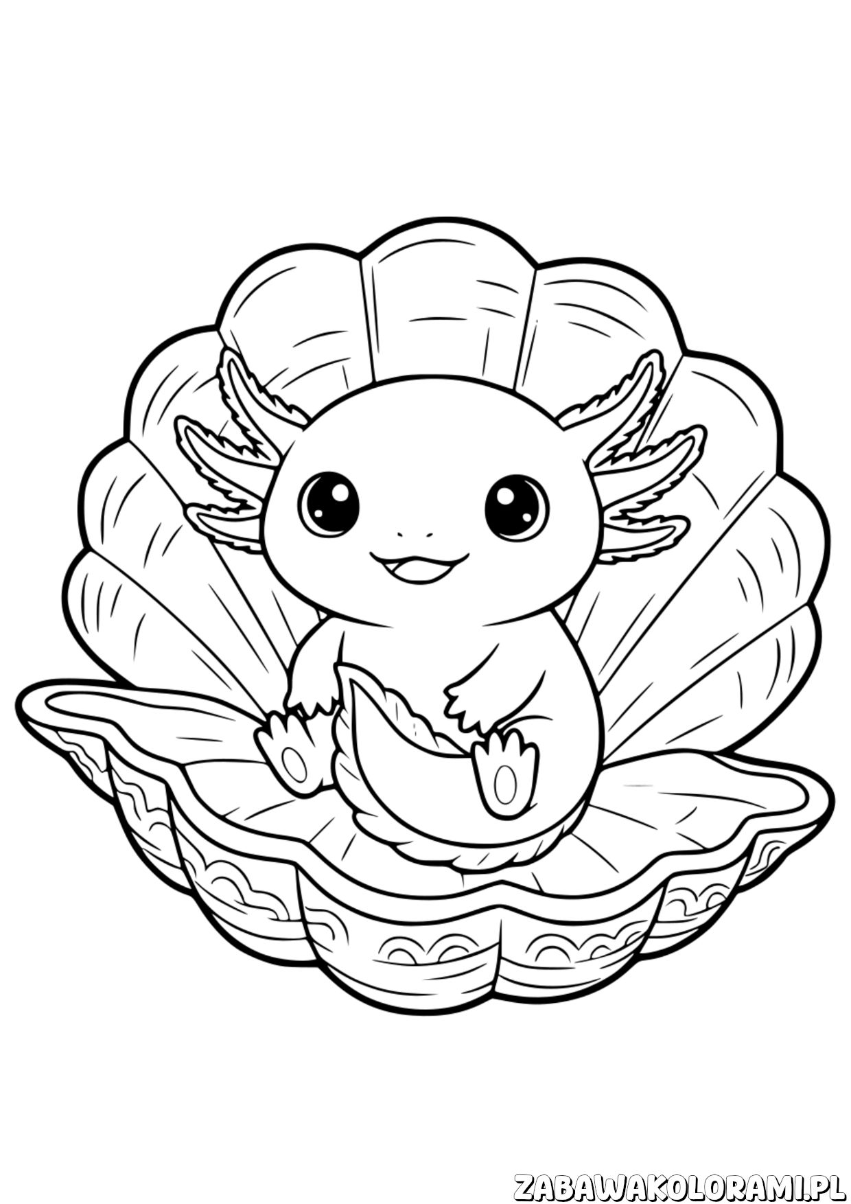 Darmowa kolorowanka aksolotl w muszli – zabawa z wodnym przyjacielem