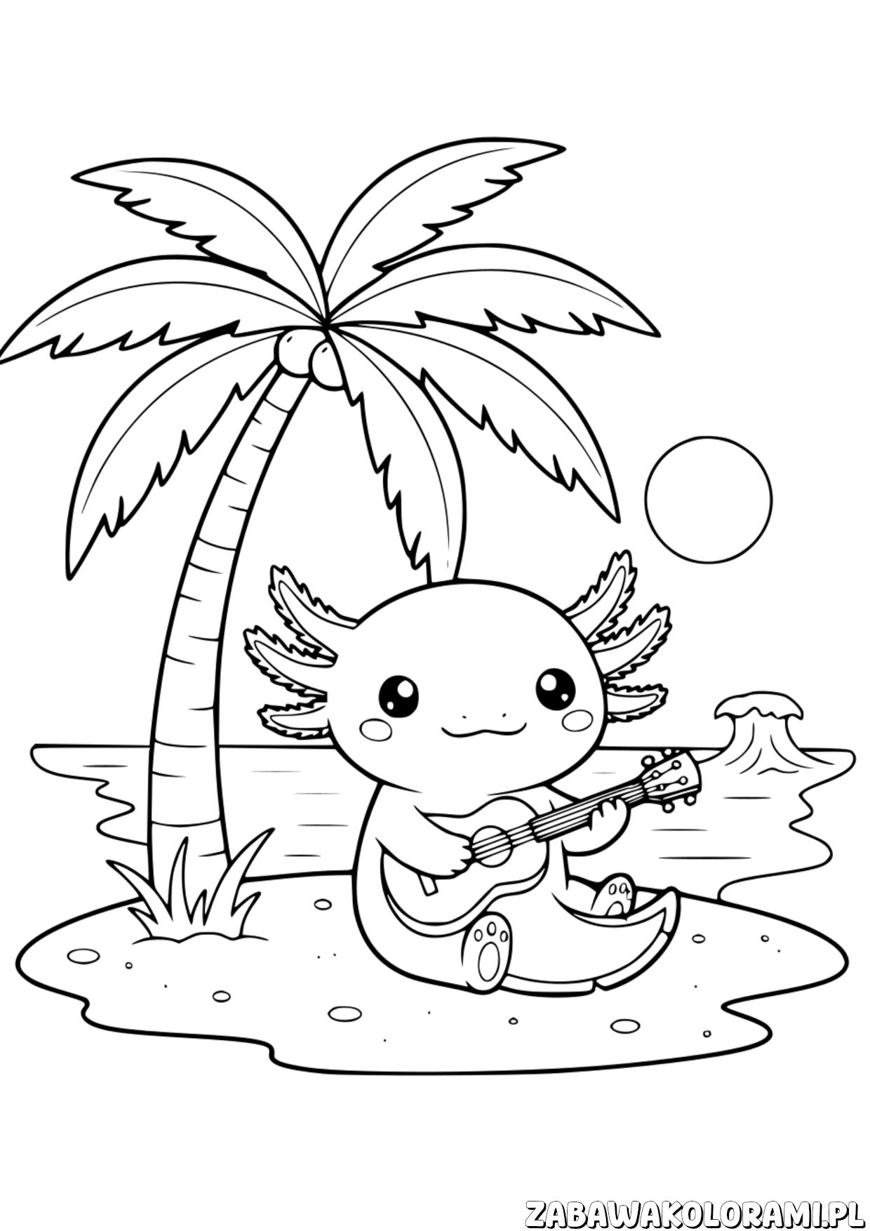 Kolorowanka Aksolotl Na Plaży - akwaryczny przyjaciel grający na gitarze na plaży
