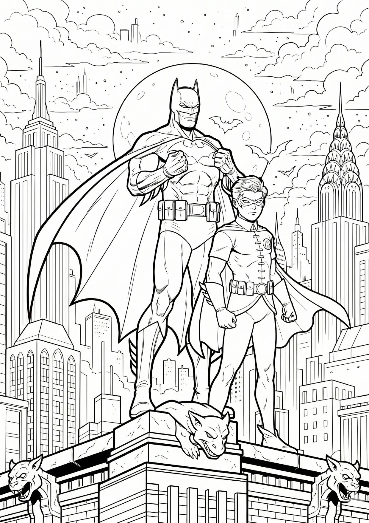 Kolorowanki Batman i Robin do druku dla dzieci. Weź kolory i pomaluj bohaterów stojących na dachu Gotham City, gotowych do przygody!