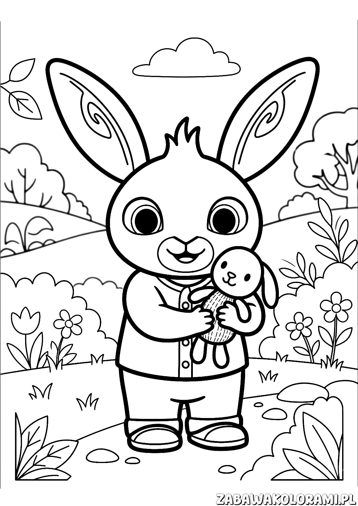 bing kolorowanka z królikiem trzymającym pluszaka w otoczeniu kwiatów i chmur