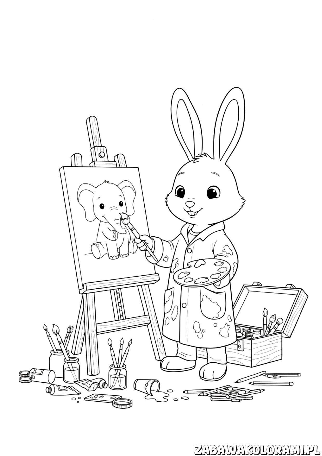 Króliczek kolorowanka dla dzieci malującego słonika Data publikacji: 19 kwietnia 2026 Króliczek kolorowanka przedstawia uśmiechniętego króliczka w fartuchu, który maluje słonika na sztalugach. Idealna kolorowanka dla małych artystów! 🖨️ Wydrukuj 📄 PDF