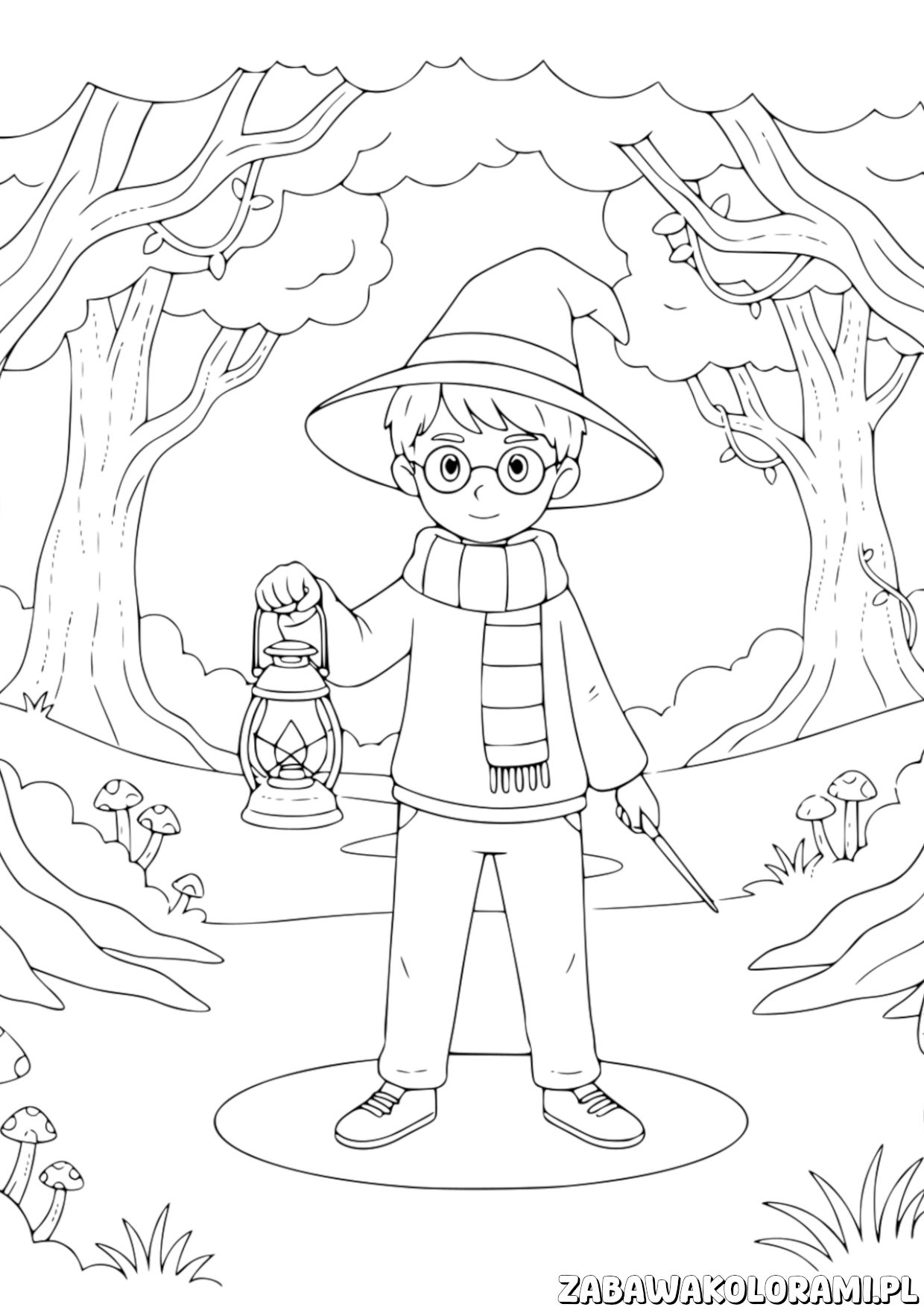 Harry Potter w lesie Kolorowanka z chłopcem w czarnoksiężnym kapeluszu i okularami, trzymającym latarnię w lesie.