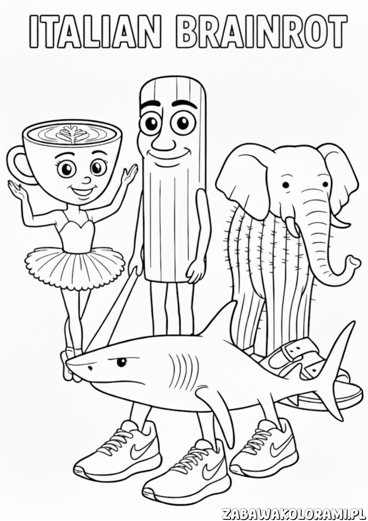 Italian Brainrot kolorowanka Data publikacji: 2 listopada 2025 Italian Brainrot – kolorowanka z wesołymi postaciami. Dołącz do zabawy z tańczącą kawą, elefantem i rekinem! 🖨️ Wydrukuj 📄 PDF