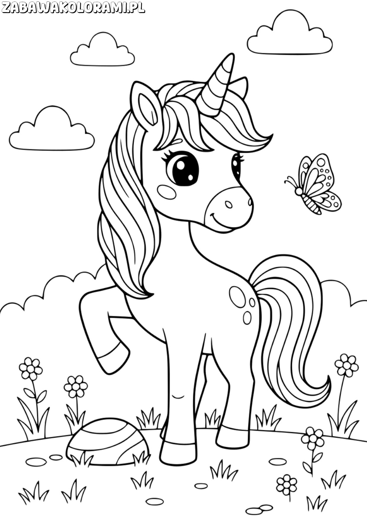 Jednorożec Kolorowanka do druku: Wyrusz w magiczne przygody z naszym uroczym jednorożcem! Pomaluj jego długą grzywę i ogon, kwiaty i motyla. Gotowy, gotowa, rusza zabawa!