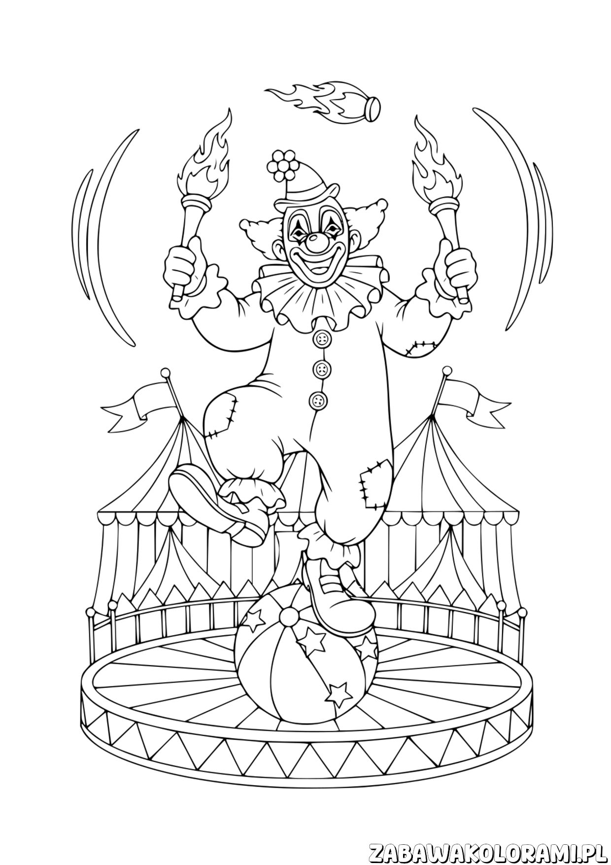 Klaun cyrkowy kolorowanka – uśmiechnięty klaun z pochodniami w cyrku