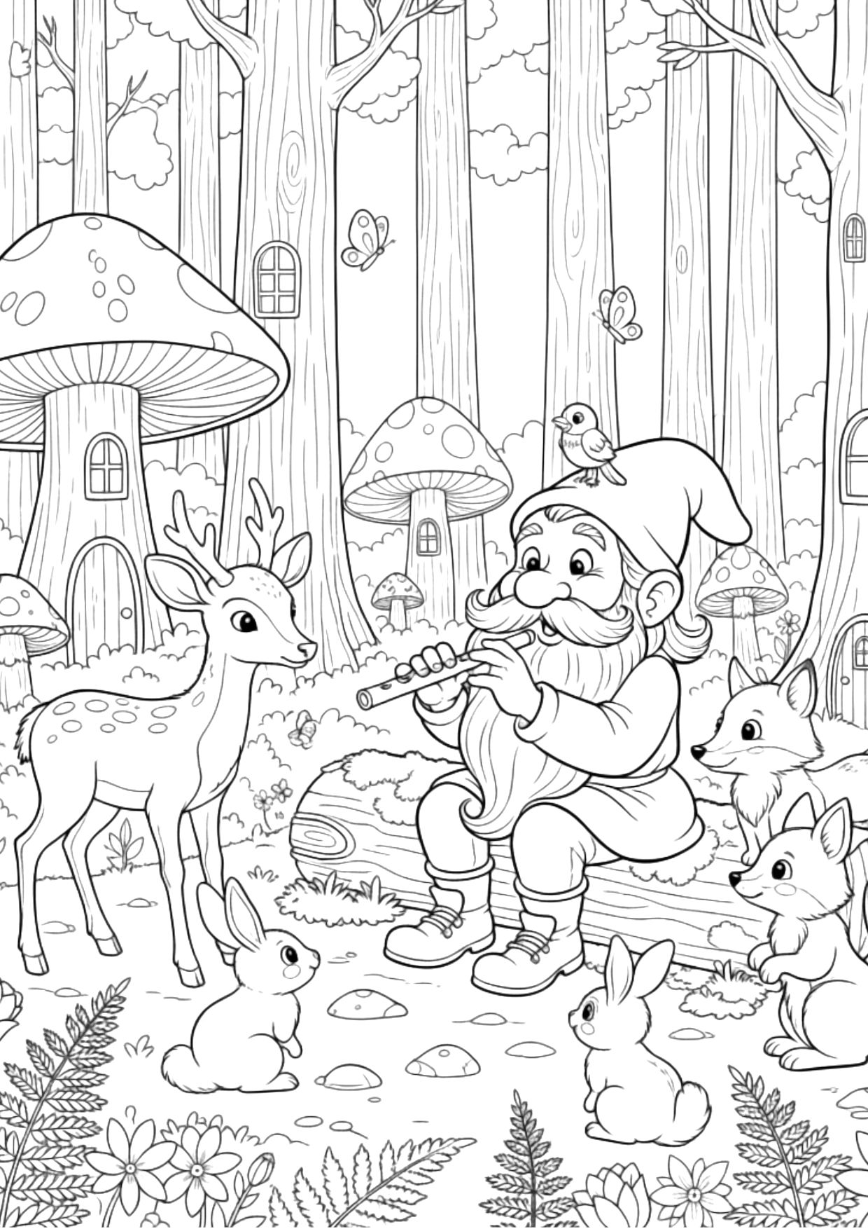Krasnoludek w lesie kolorowanka – pobudź wyobraźnię! Koloruj krasnala z zwierzakami w magicznym lesie. Idealne dla dzieci.