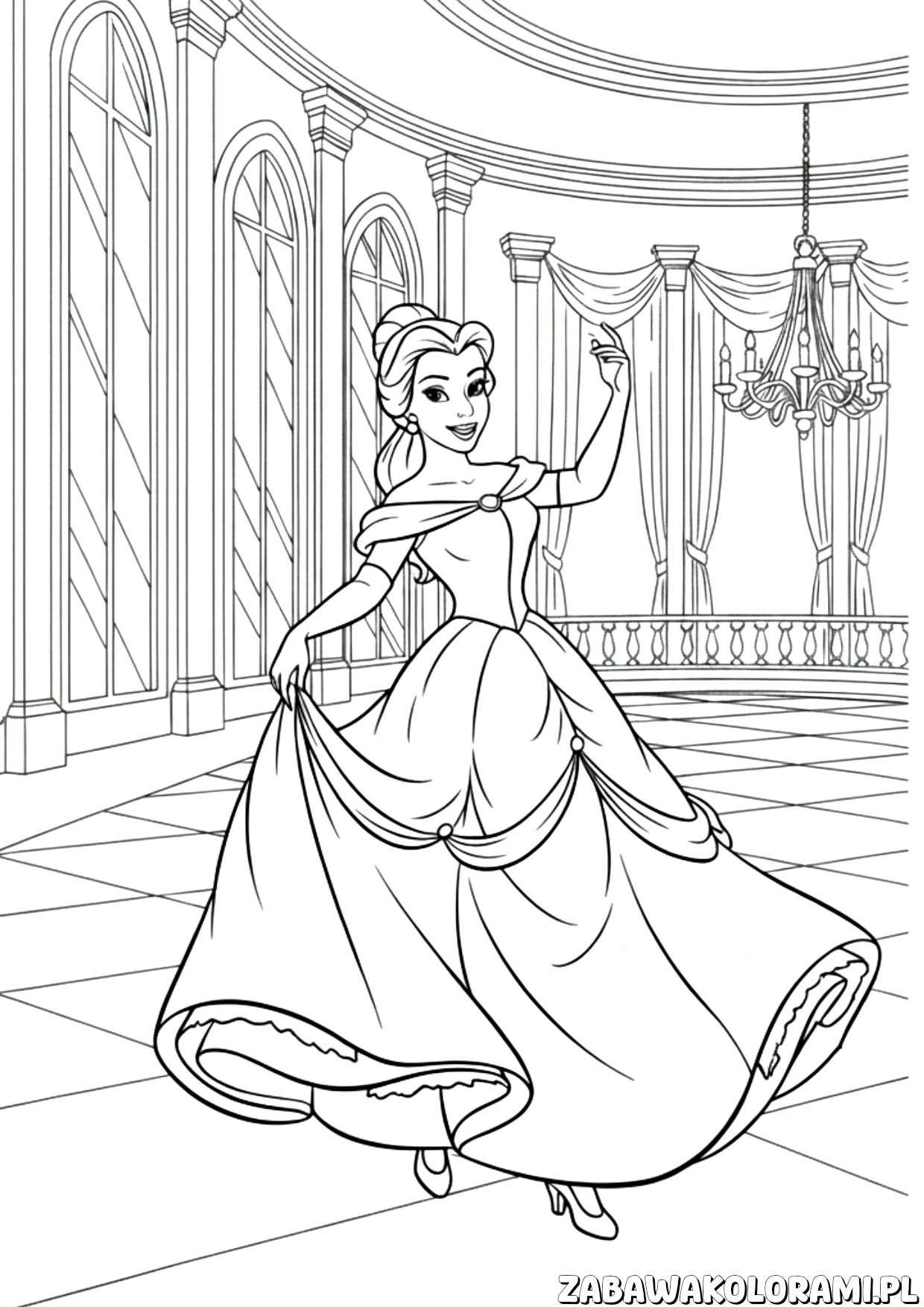 Kolorowanka księżniczki Bella przedstawia księżniczkę w eleganckiej suknio, tańczącą w królewskim wnętrzu