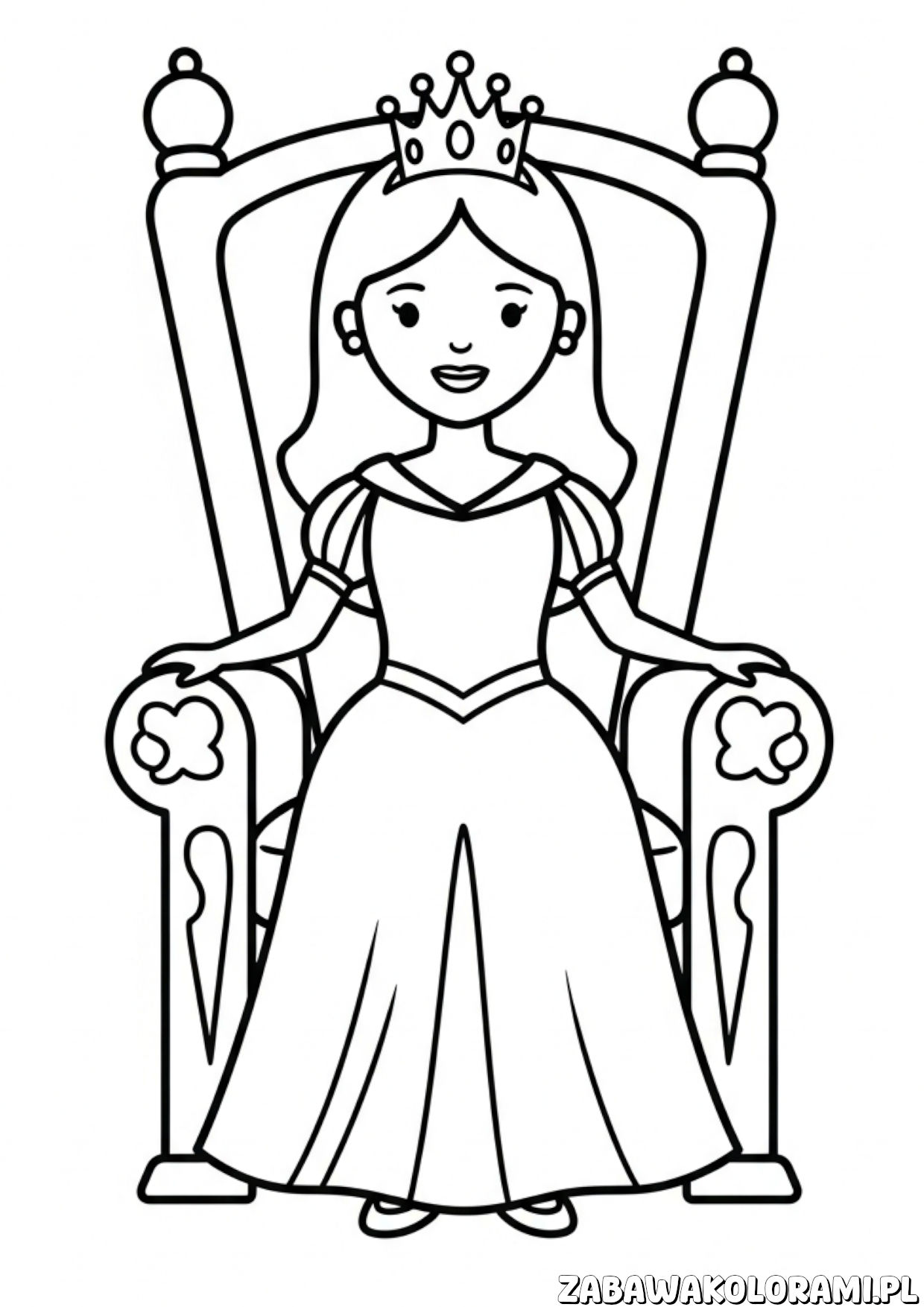 Kolorowanka księżniczki dla dzieci: Wypraw się w magiczne królestwo i pokoloruj piękną księżniczkę na tronie! Idealna zabawa dla najmłodszych.