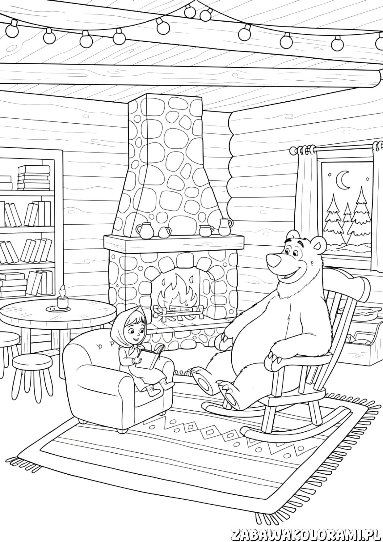 Kolorowanka dla dorosłych Masza i niedźwiedź to kolorowanka w kolorach czarno białym. Przedstawia przytulny pokój z niedźwiedziem w fotelu i Maszą czytającą książkę przy kominku.
