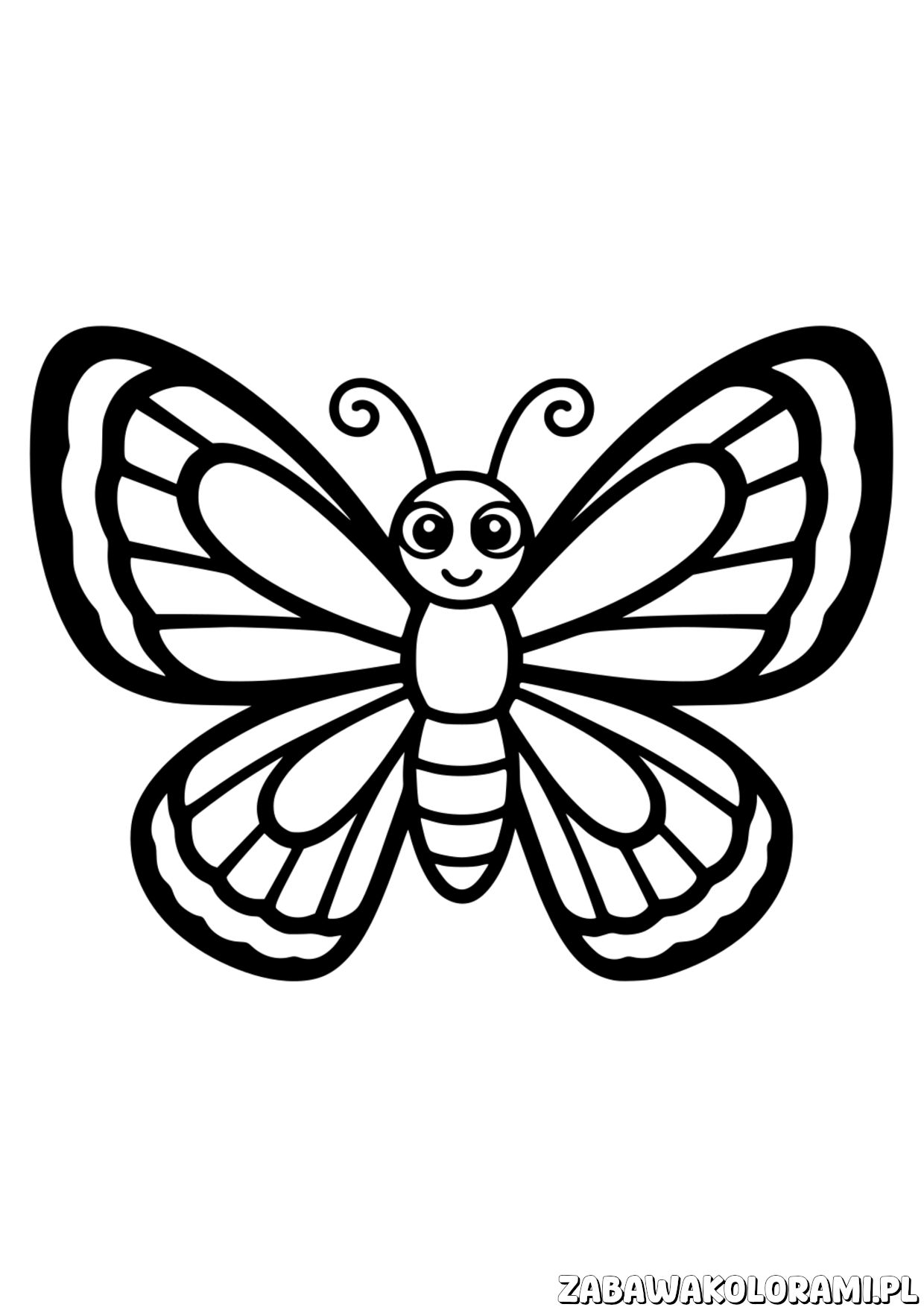 Kolorowanka Motyl zachęca do twórczego malowania. Uśmiechnięty motylek z łukowatymi skrzydłami czeka, by ożywić swoje barwy!