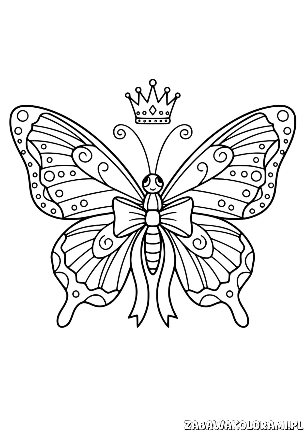 Motyl Kolorowanka z koroną, ozdobnymi skrzydłami i wzorami do kolorowania przez dzieci