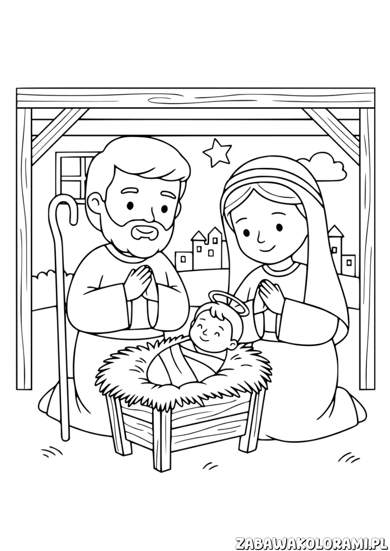 Kolorowanka Stajenka Betlejemska: Wyrusz w magiczne podróż! Koloruj scenę narodzin Jezusa, Maryję, Józefa i stajenkę. Kreatywna zabawa gwarantowana!