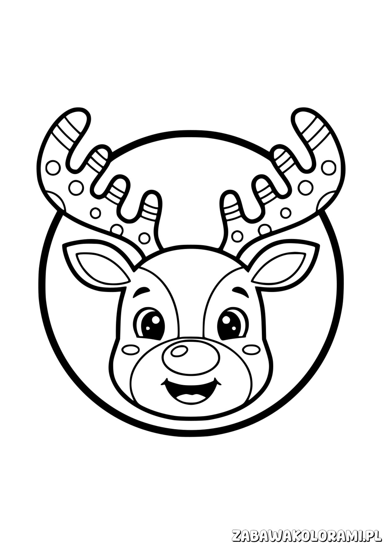 Kolorowanki Renifery do druku - kolorowanka z reniferką o uśmiechniętej twarzy.