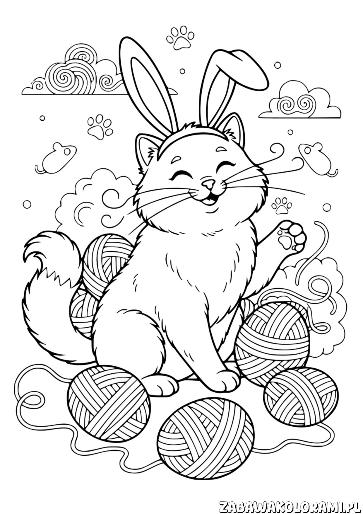 kolorowanki wielkanocne do druku z kotem z króliczymi uszami, który knuje z kulką wełny w otoczeniu chmurek i pawich śladów