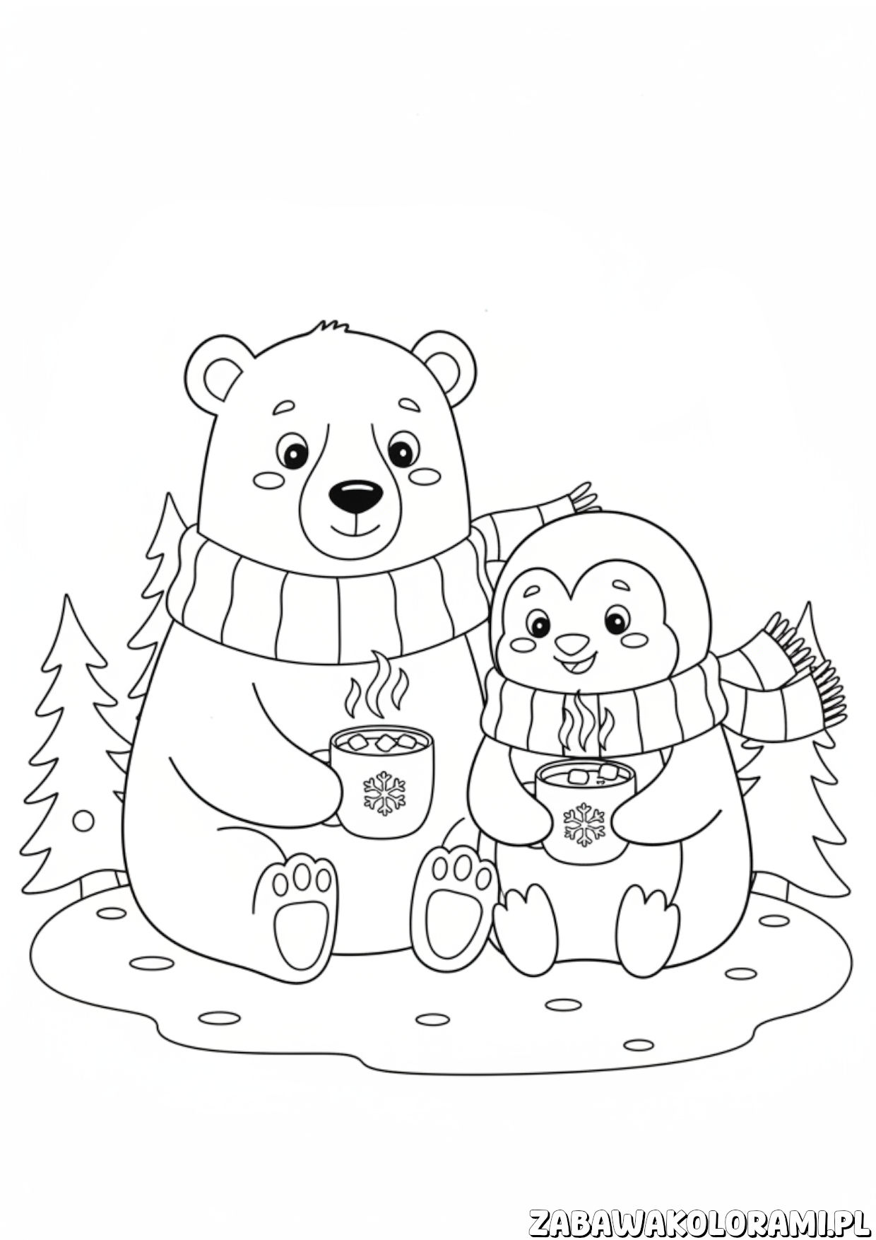 Kolorowanka zima – niedźwiedzie w zimowej scenerii Data publikacji: 8 listopada 2025 Kolorowanka zima przedstawia niedźwiedzie w ciepłych szalikach. Pobudź wyobraźnię i koloruj zimową przygodę! 🖨️ Wydrukuj 📄 PDF