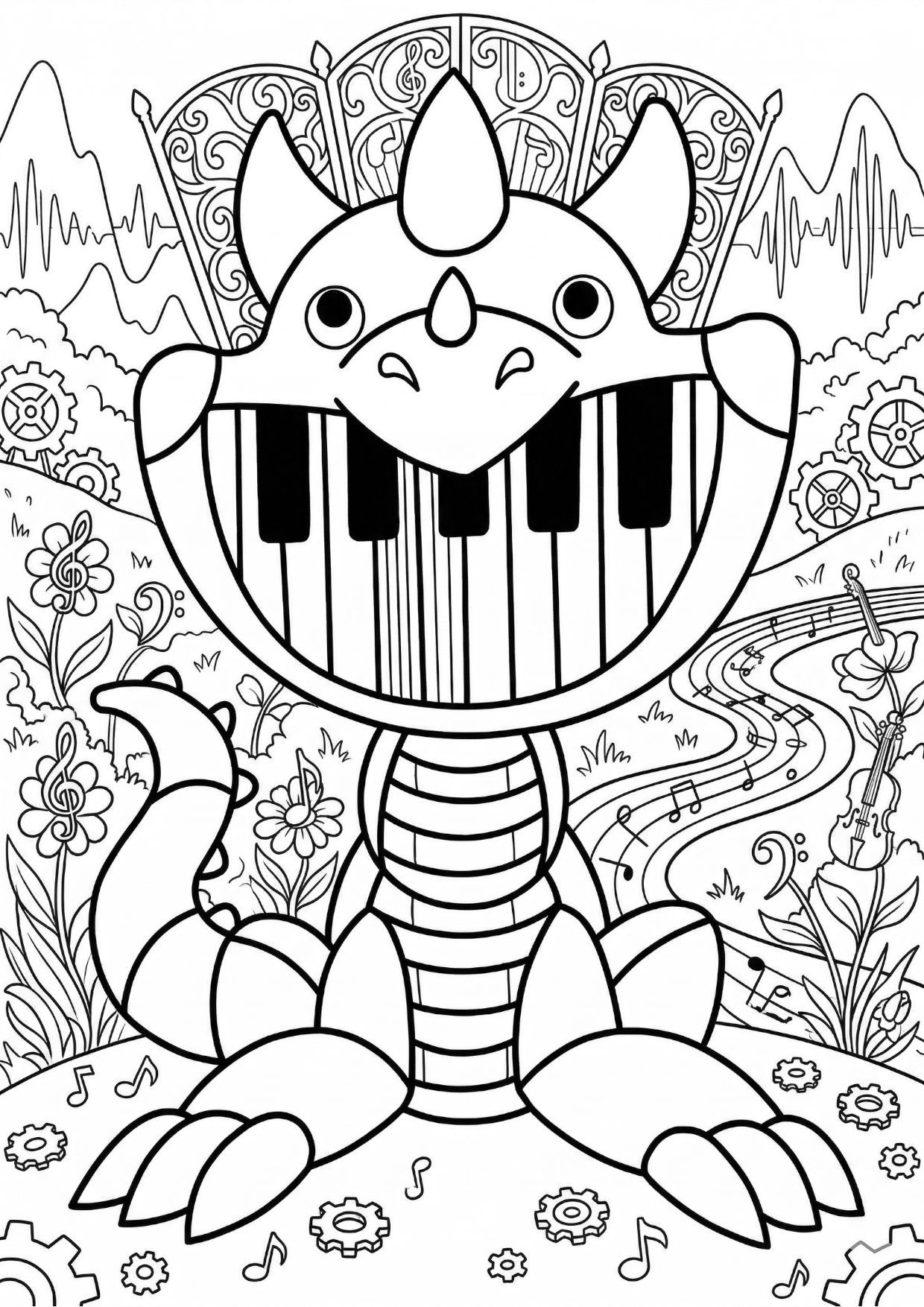 Pianosaurus Kolorowanka Poppy Playtime zaprasza do kolorowania! Poznaj uśmiechniętego stworka z pianinem i nutkami. Idealna kolorowanka dla małych muzyków!