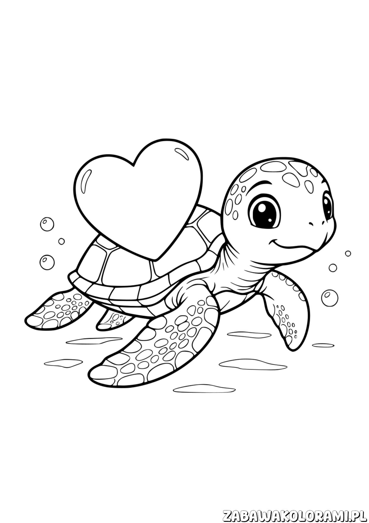 Żółw z sercem – Kolorowanka Walentynki. Pomaluj uśmiechniętego żółwia z wielkim sercem i zanurz się w magii Walentynków!